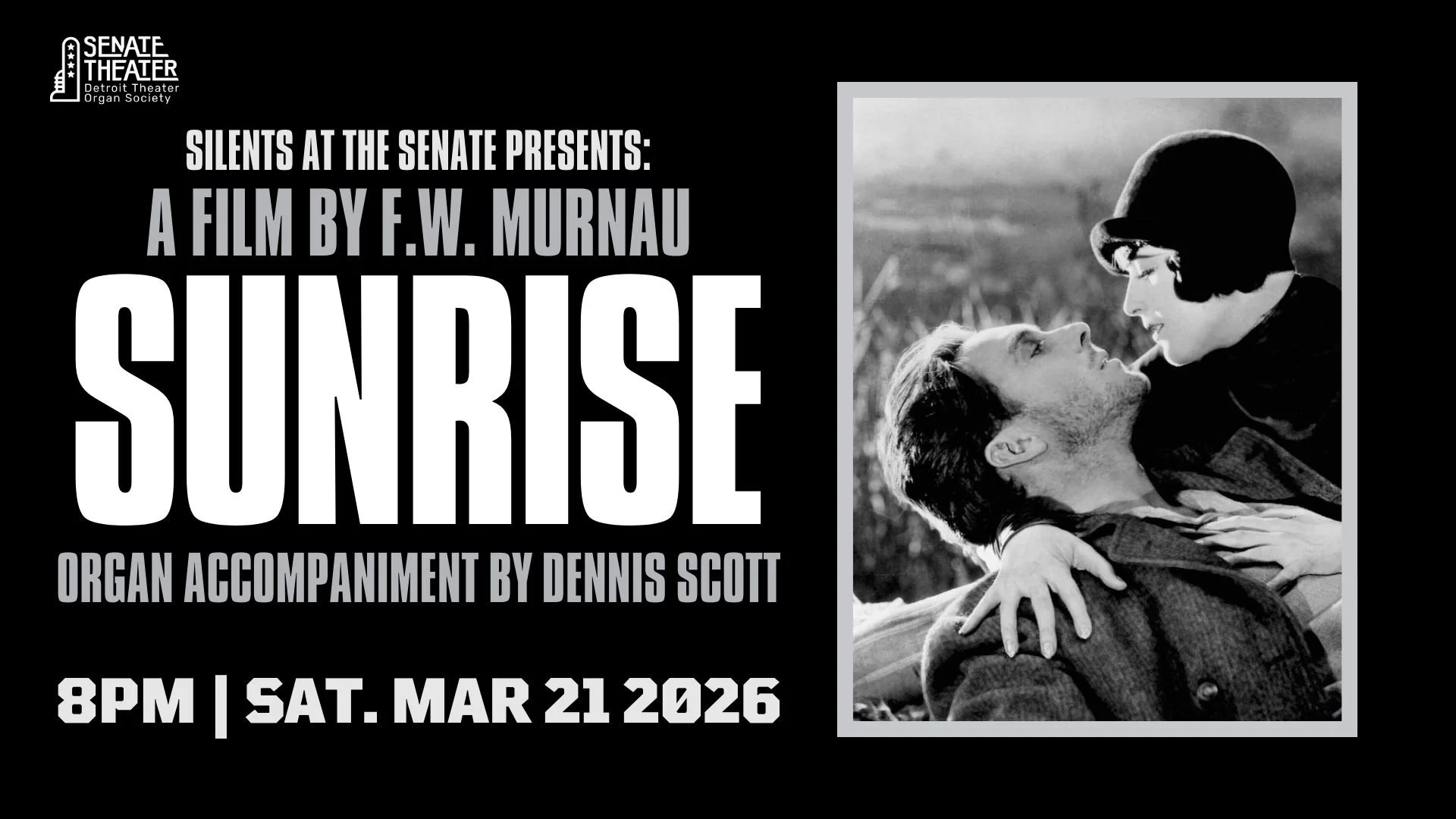 Our friends at the historic Senate Theater continue their fantastic silent film series with a screening of the legendary Sunrise: A Song of Two Humans (1927) this Saturday.